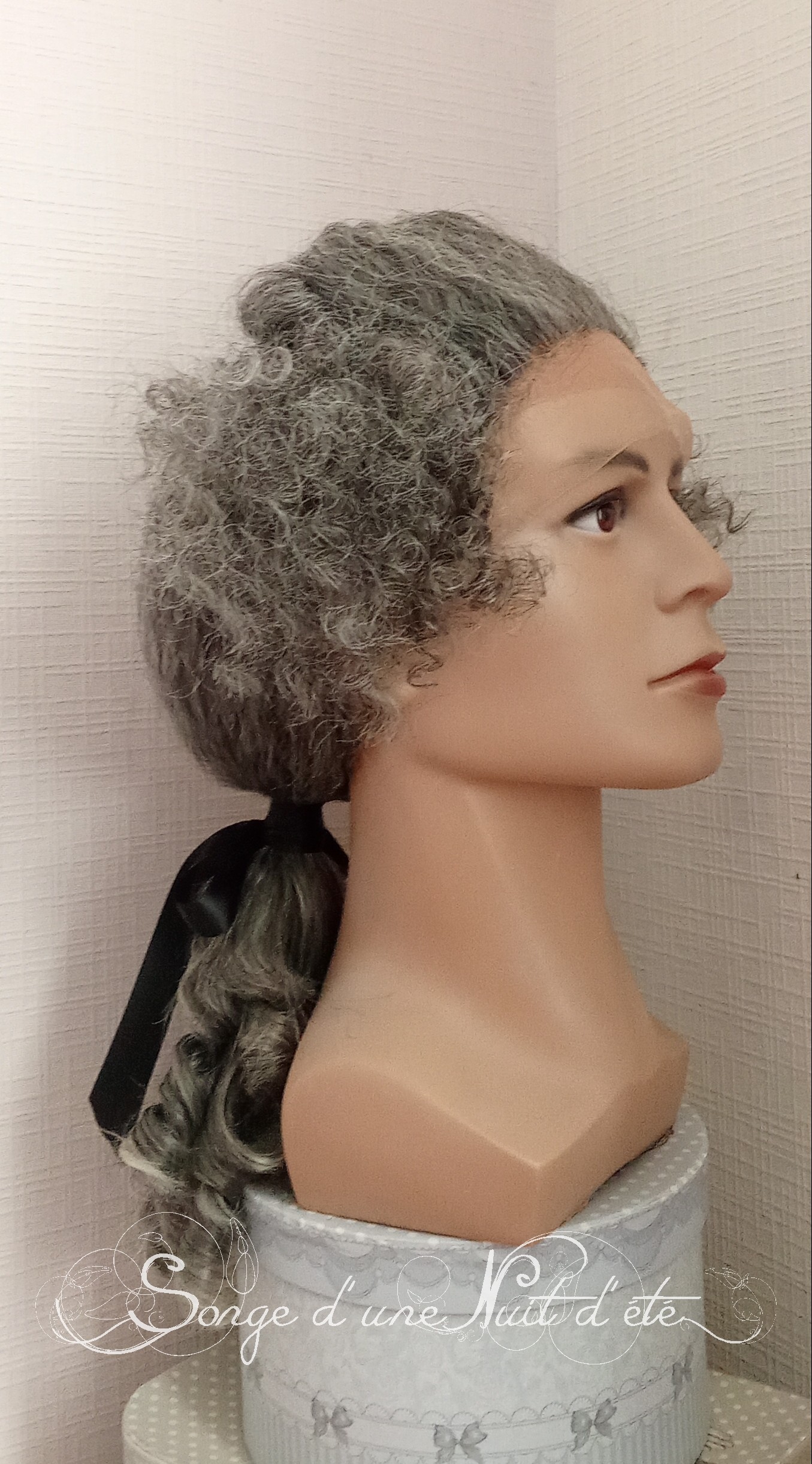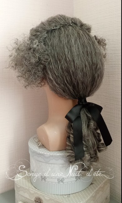 Perruque lace front fibre synthétique, toupet et frisures, ruban catogan court, coloris poivre et sel. Cette coiffure XVIIIe complétera vos tenues pour vos reconstitutions et évenements costumés tels la Journée Grand Siècle, Venise, les Fetes Galantes de Versailles ...